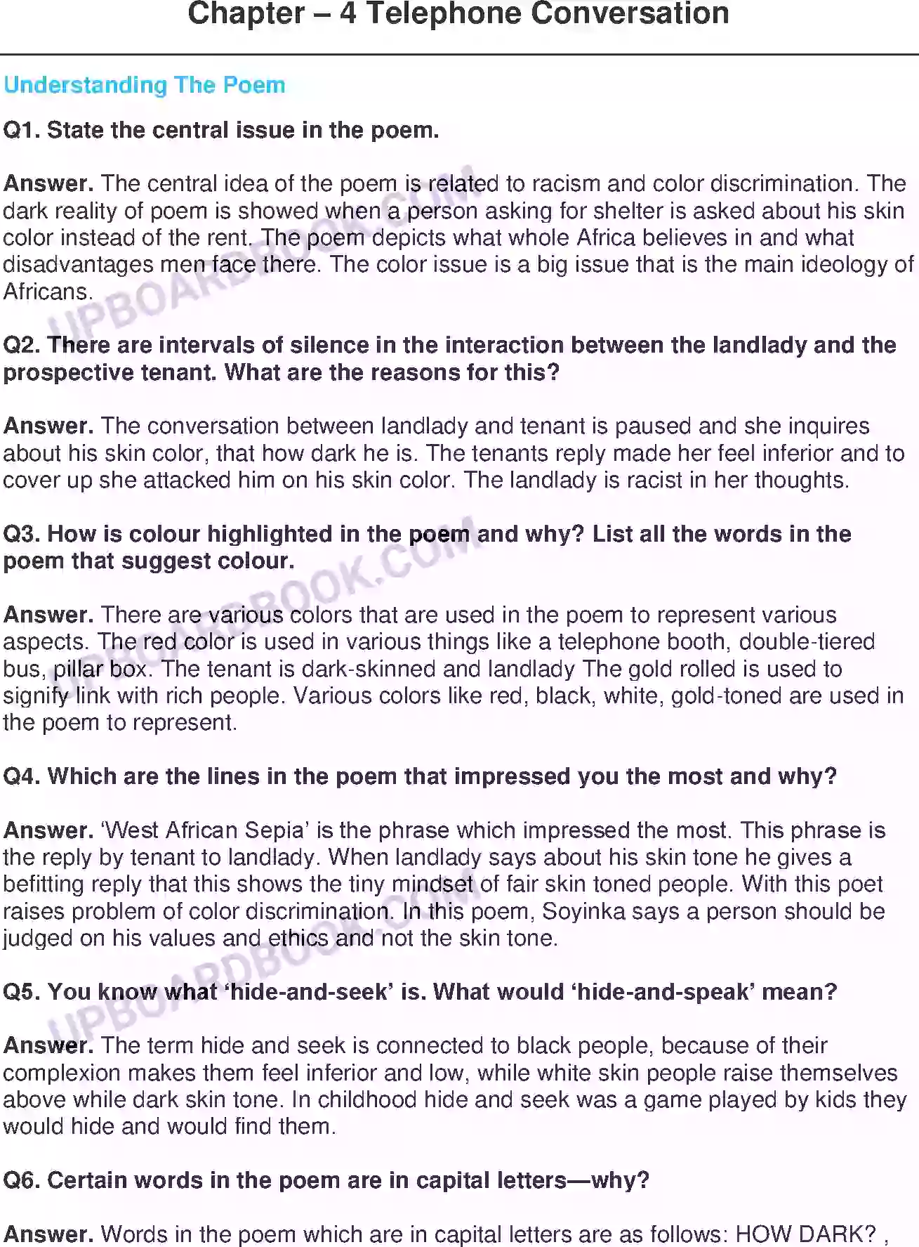 UP Board class 11 English 12. Telephone Conversation - (Poetry) Solution is available at our platform https://upboardSolution.com in hindi medium for free of cost. Content provided on our website is free of cost and in PDF format which is easily available for download. Getting the UP Board Solutions for class 11 will help student to achieve good learning experience so that they can study effectively. UP board holds examination of more than 3 million students every year and majority of the question of exams are from their UP Board Solutions. That’s why it is important to study using the textSolution issued by UP Board.